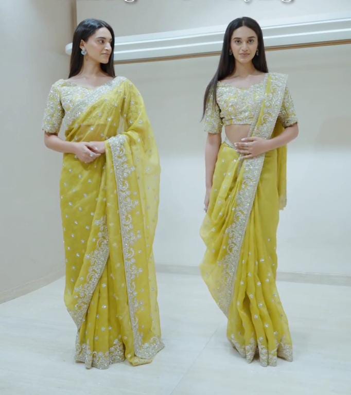 FABRIC DETAILS : LEHENGA : Twill organza ruffle style with drape and thread work. INNER...