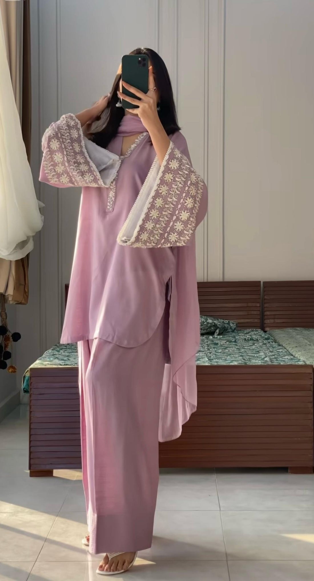 TOP DETAILS : FABRIC : Natural Satin with Embroidery Work and Sleeves. INNER : Micro...
