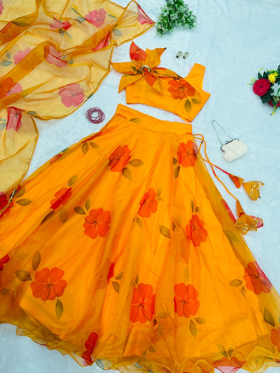Yellow Color Organza Lehenga With Flower Pattern Blouse