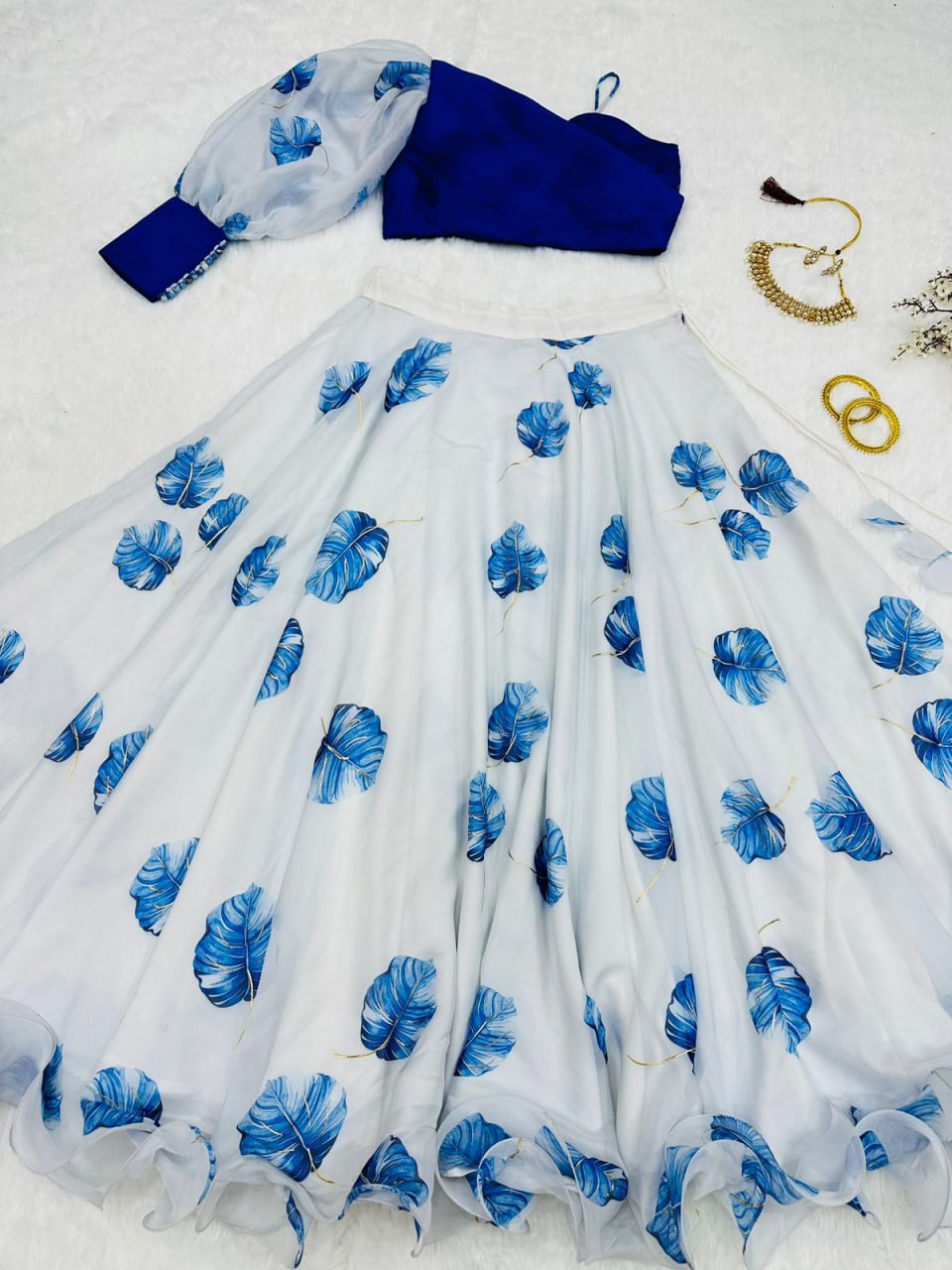 Elegant Sky Blue Color Printed Organza Lehenga Choli