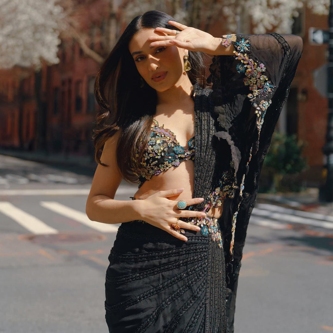 The ethereal beauty of this magical black ensemble lies in its intricate hand-embroidered patterns, meticulously...