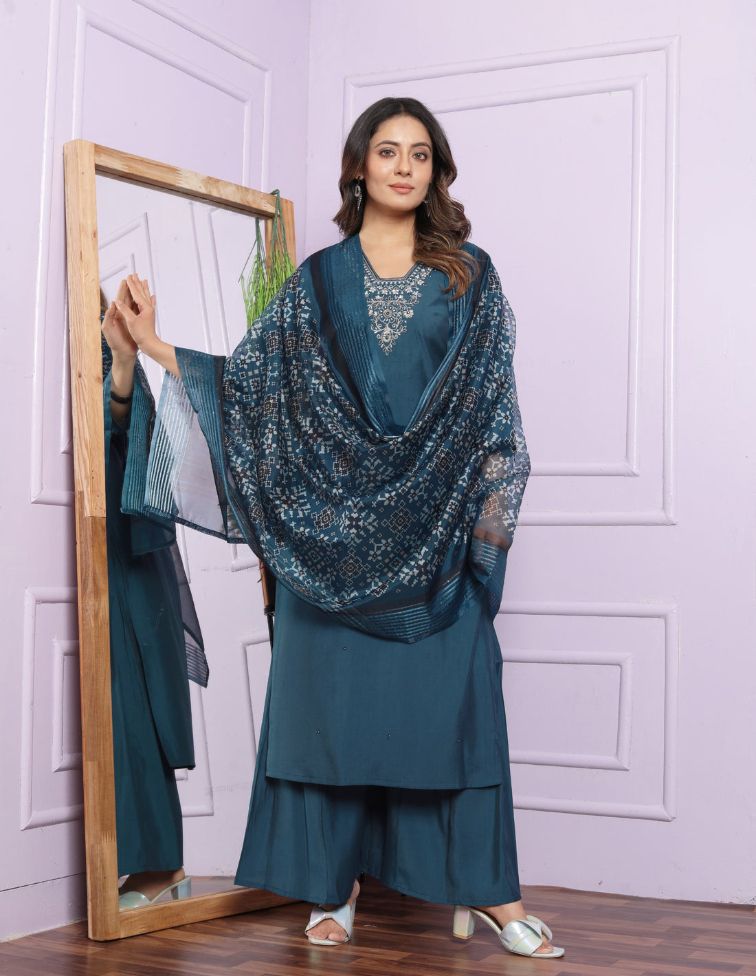 Blue Color Hand Work Art Silk Palazzo Style Salwar Suit