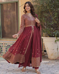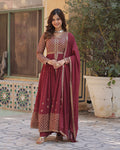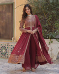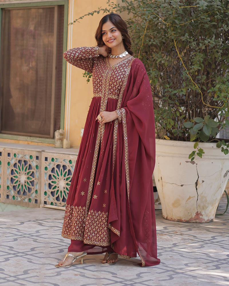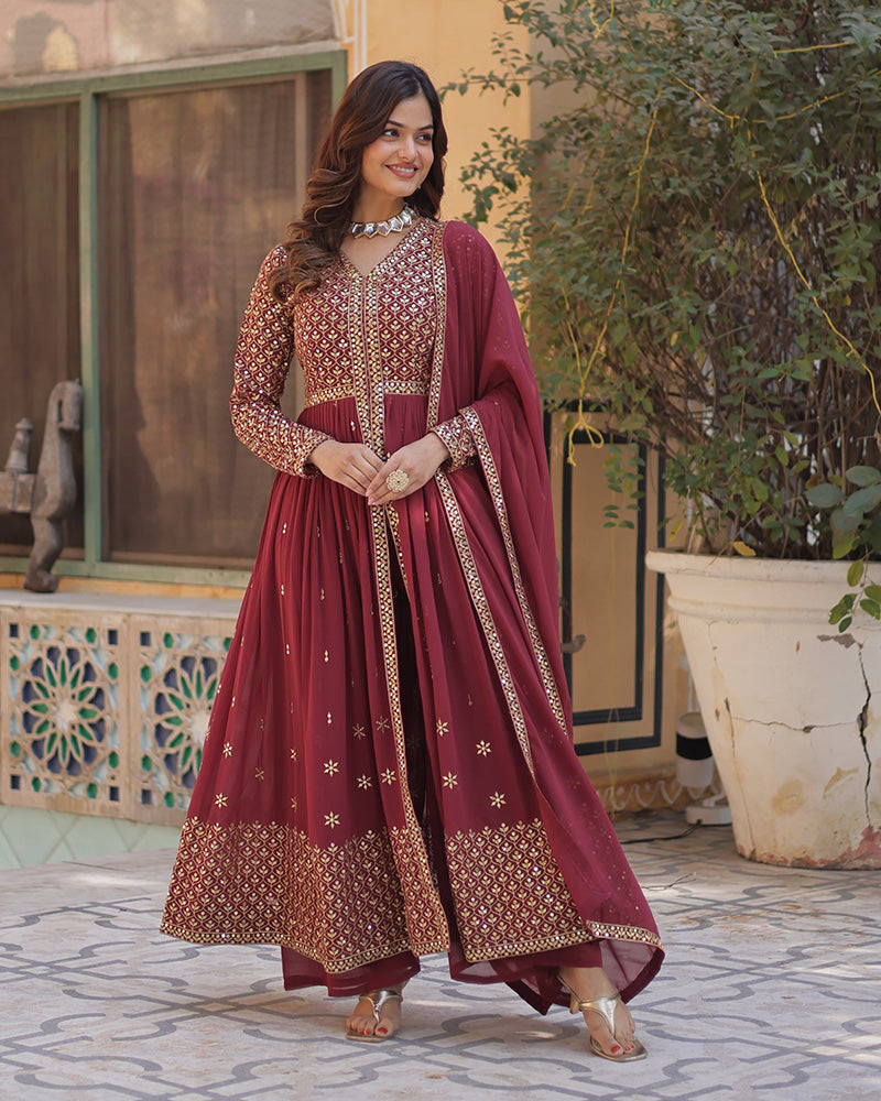 Elegant Designer Brown Three-Piece Sharara Suit featuring a beautifully embellished kameez, flared sharara pants, and a matching dupatta. Perfect for festive celebrations and special occasions with a touch of sophistication.