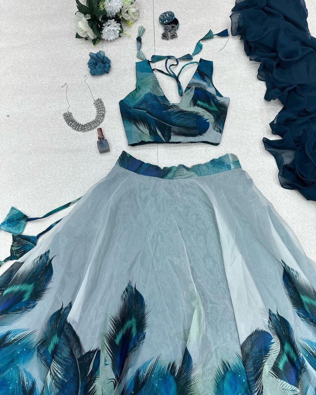 Designer Feather Print Sky Blue Color Organza Silk Lehenga Choli
