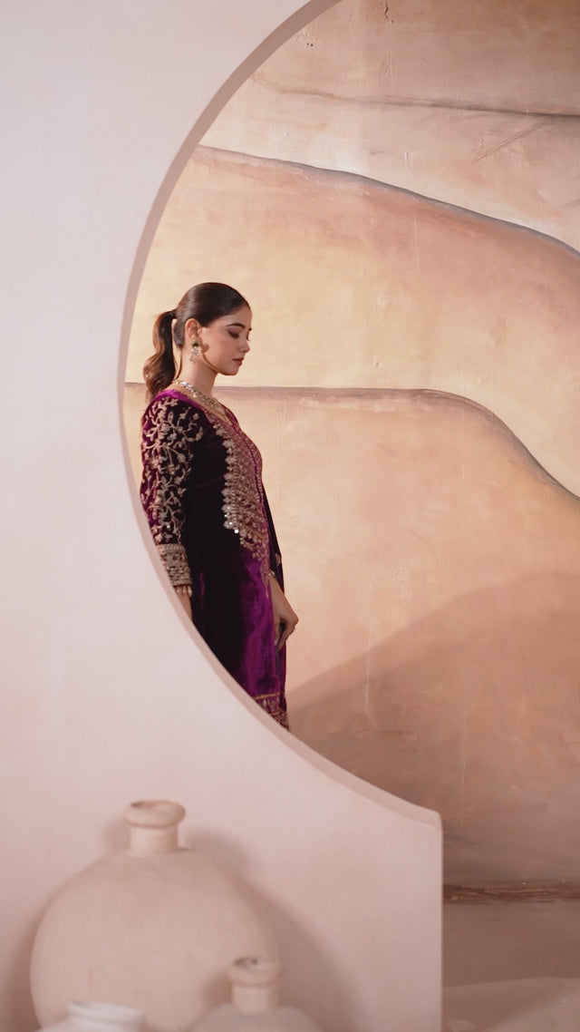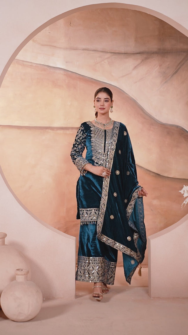 Pure heavy viscose velvet suit set with heavy embroidery coding sequence work and full embroidered sleeves. Comes with matching pant and dupatta, both detailed with elegant embroidery.- NF-1231