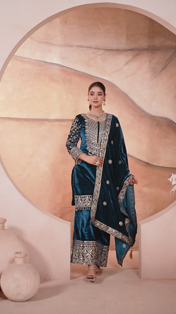 Designer Heavy Viscose Velvet Embroidery Sequence Work Suit Set with Pant and Dupatta