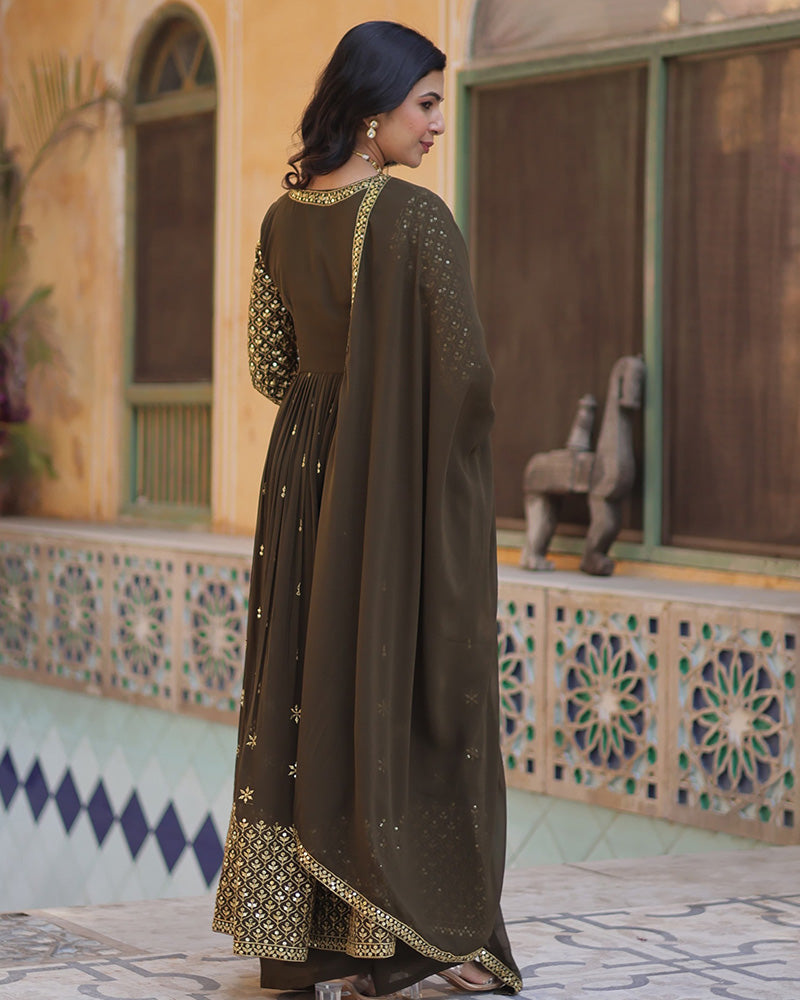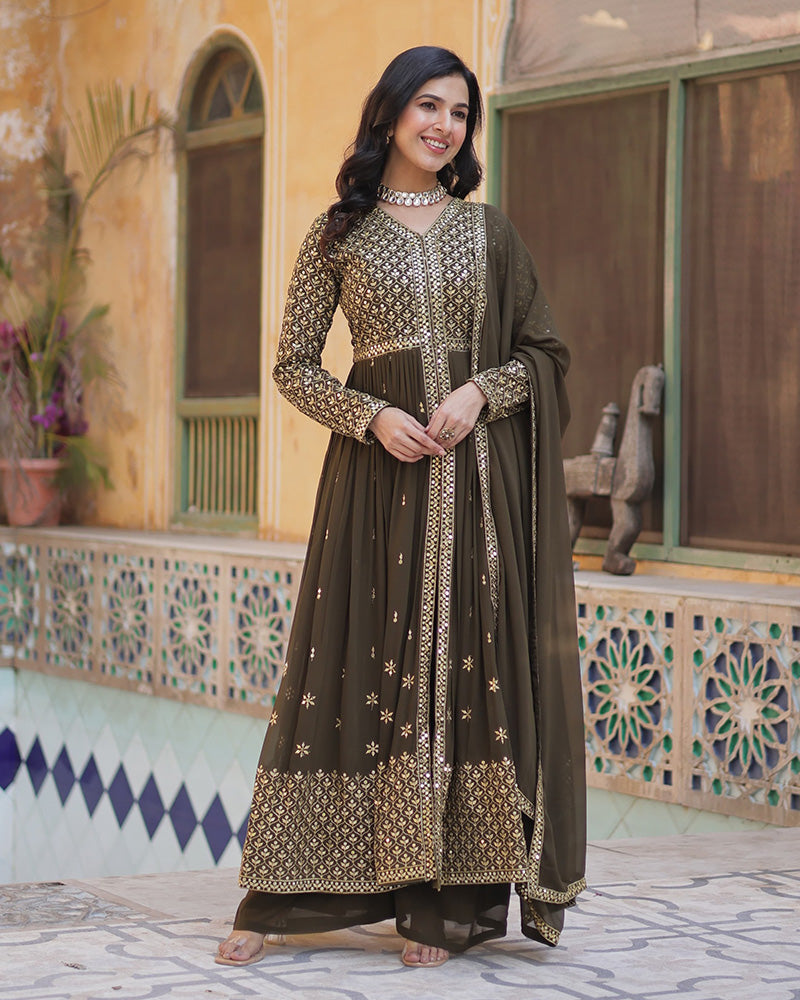 Elegant Designer Mehndi Color Three-Piece Sharara Suit featuring a beautifully embroidered kameez, flared sharara pants, and a matching dupatta. Perfect for festive occasions and weddings, exuding grace and sophistication.