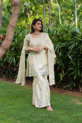 Expertly crafted from luxurious Chinon Silk, this off-white Kurti Gharara Set by Chakrika is a must-have for any wardrobe. Its elegant design and high-quality fabric ensure both comfort and style. Perfect for any occasion, this set is a timeless addition to your collection.