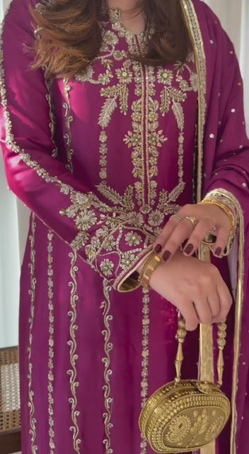 A stylish long suit set crafted in premium natural crepe silk, designed for an elegant and festive look. Featuring detailed multi-needle embroidery with sequence work, this outfit offers a perfect combination of sophistication and comfort, ideal for special occasions.