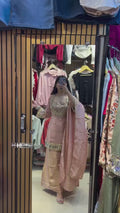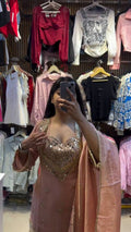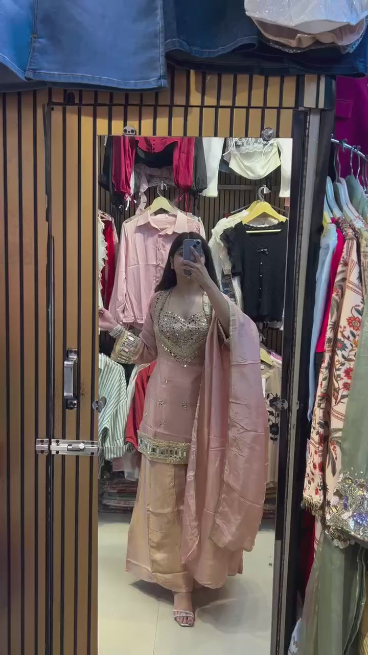 Shine at weddings and festive occasions with this elegant 4-piece palazzo set featuring real mirror work and delicate embroidery.