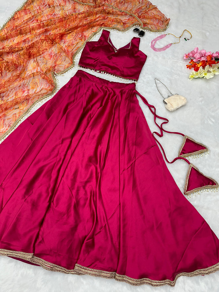 Fancy Satin Silk Pink Lehenga Choli With Net Dupatta