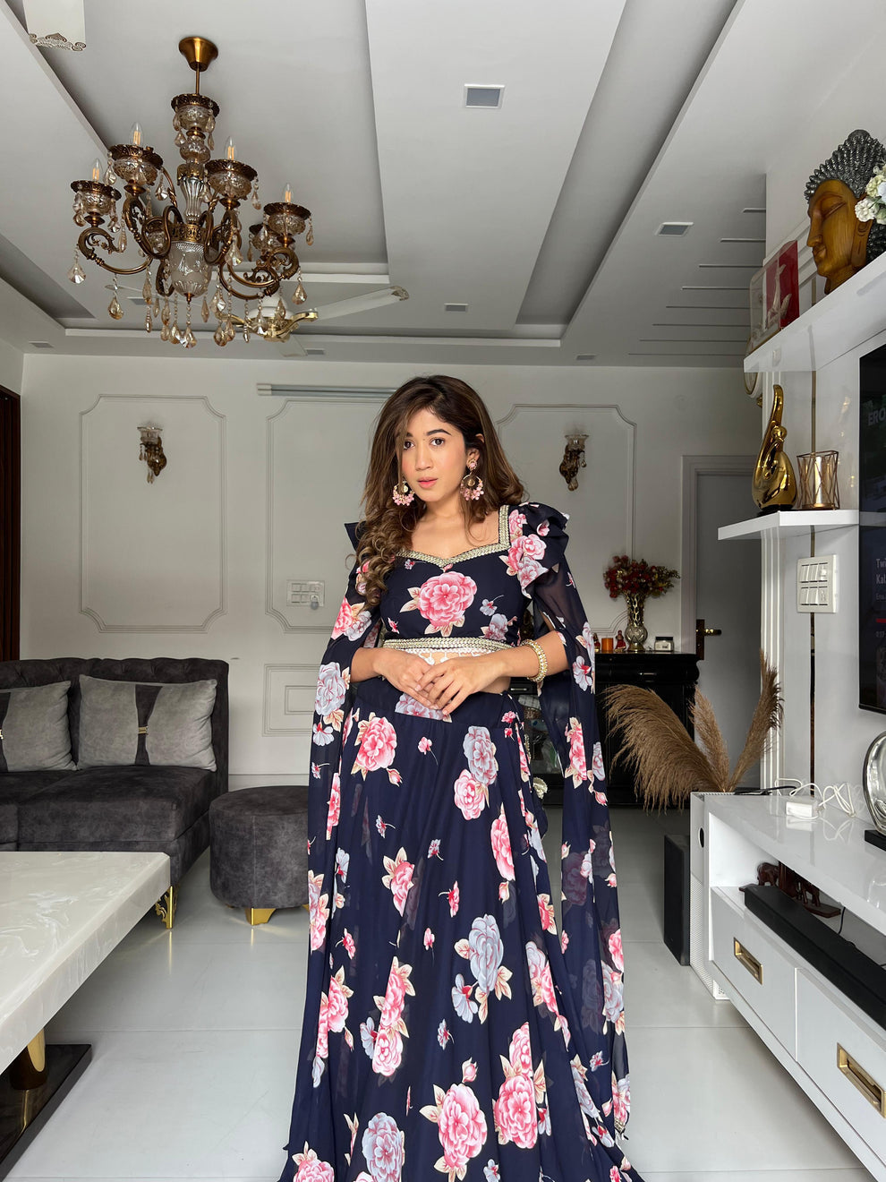Fabric Georgette Lehnga Work Digital Printed Type Fully stitched Length 42" Size Up To 44" Size Flair Canvas Patta And Waist Dori Fully Stitched Choli Fabric Georgette Blouse Work Handcrafted and Designer Lace Work! Attached Dupatta Pattern Blouse Type Fully stitched Size Size 38 Padded Blouse (Margin Given) Occasion Party Wear, Ceremony Wear Product Care Instructions Dry Clean Only