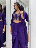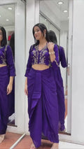 Turn every festive moment into a fashion statement with this trendy Dhoti & Blouse set crafted in soft Chinon silk. Adorned with sequin & cording embroidery, this outfit is perfect for weddings, festive parties, or sangeet nights. Style meets comfort in one perfect look!