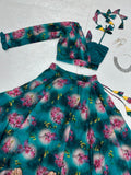Floral Printed Teal Blue Color Lehenga With One Shoulder Blouse