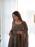 This exquisite ensemble features a rich maroon hue that exudes sophistication. The Anarkali silhouette adds a touch of regality, while intricate embellishments and delicate embroidery enhance its overall allure. The flowing floor-length design creates a graceful and flattering look, perfect for special occasions and celebrations.