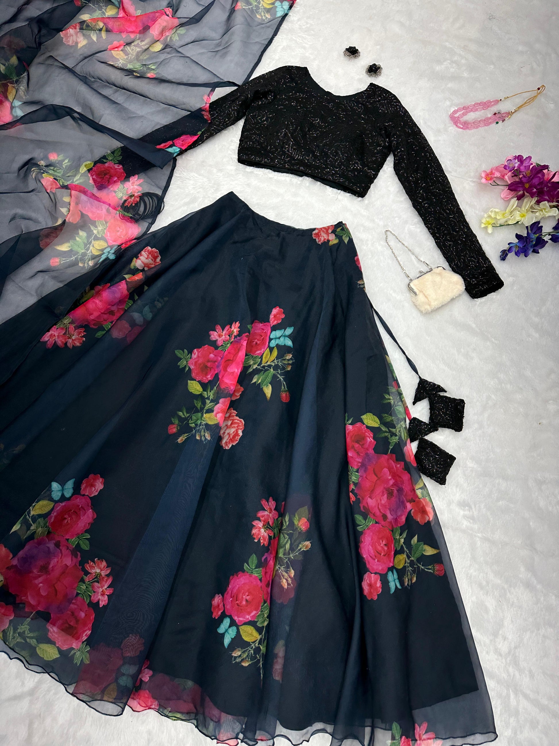 Latest Designer Black Organza Silk Floral Printed Lehenga Choli
