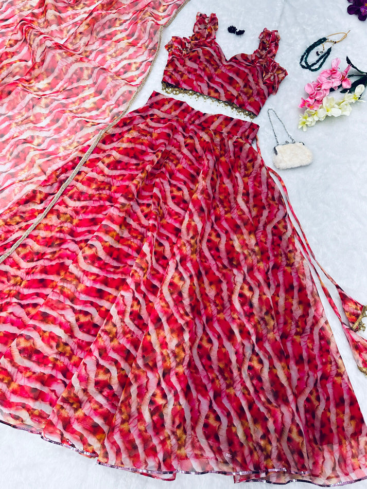 Fabric Pure Organza Silk Work Digital Printed Lehenga 8mtr Flair Lehnga With Canvas Patta Type Fully stitched Length 42" Size Up To 44" Size Choli Fabric Pure Silk Organza Work Blouse With Handwork Type Fully stitched Size Size 38 Blouse (Margin Given) Dupatta Fabric Organza Dupatta With Lace Border Type 2 Meter Occasion Party Wear, Ceremony Wear Product Care Instructions Dry Clean Only
