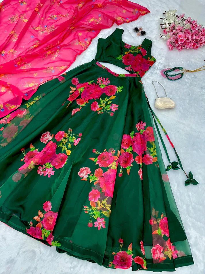 Multi Floral Print Green Color Organza Silk Lehenga Choli