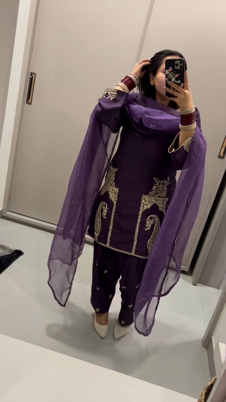 New Pure Natural Crep Satin Top&Farshi&Dupatta Set Fully Stitched Ready To Wear