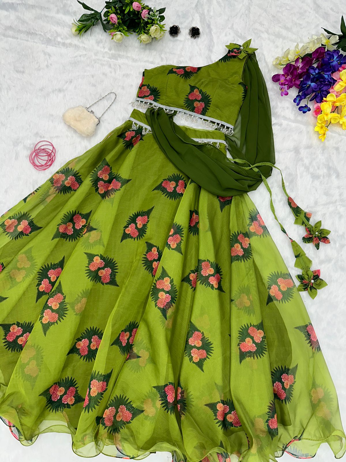Organza Silk Digital Print Green Lehenga Fancy Blouse