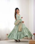 Elegant pista green Anarkali suit in pure Roman silk, featuring a stylish ruffle design. A perfect blend of grace and charm for festive and special occasions.