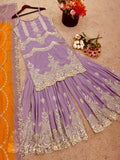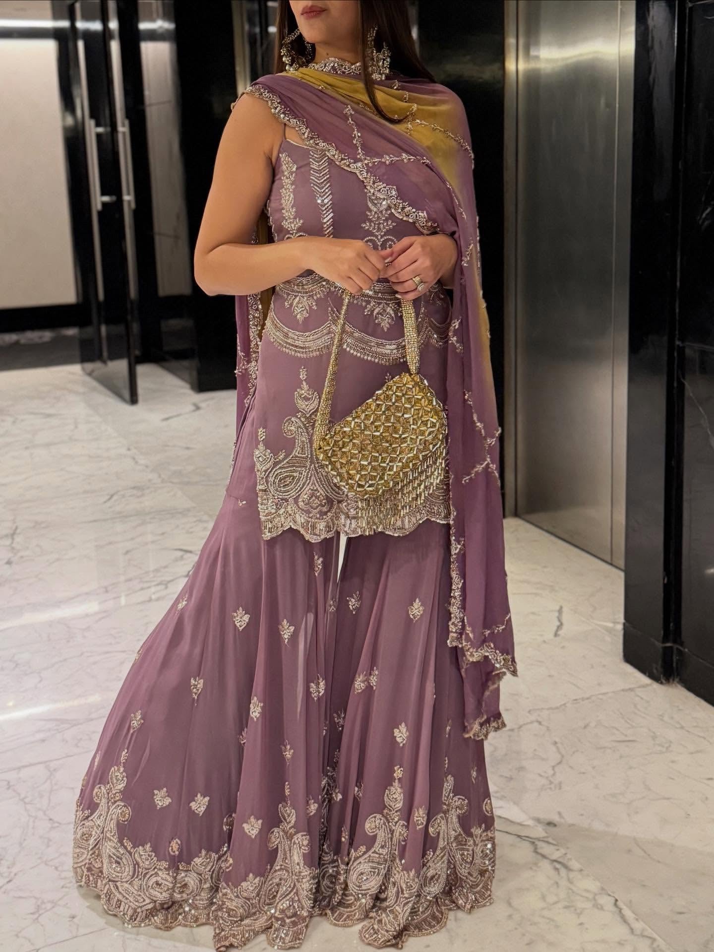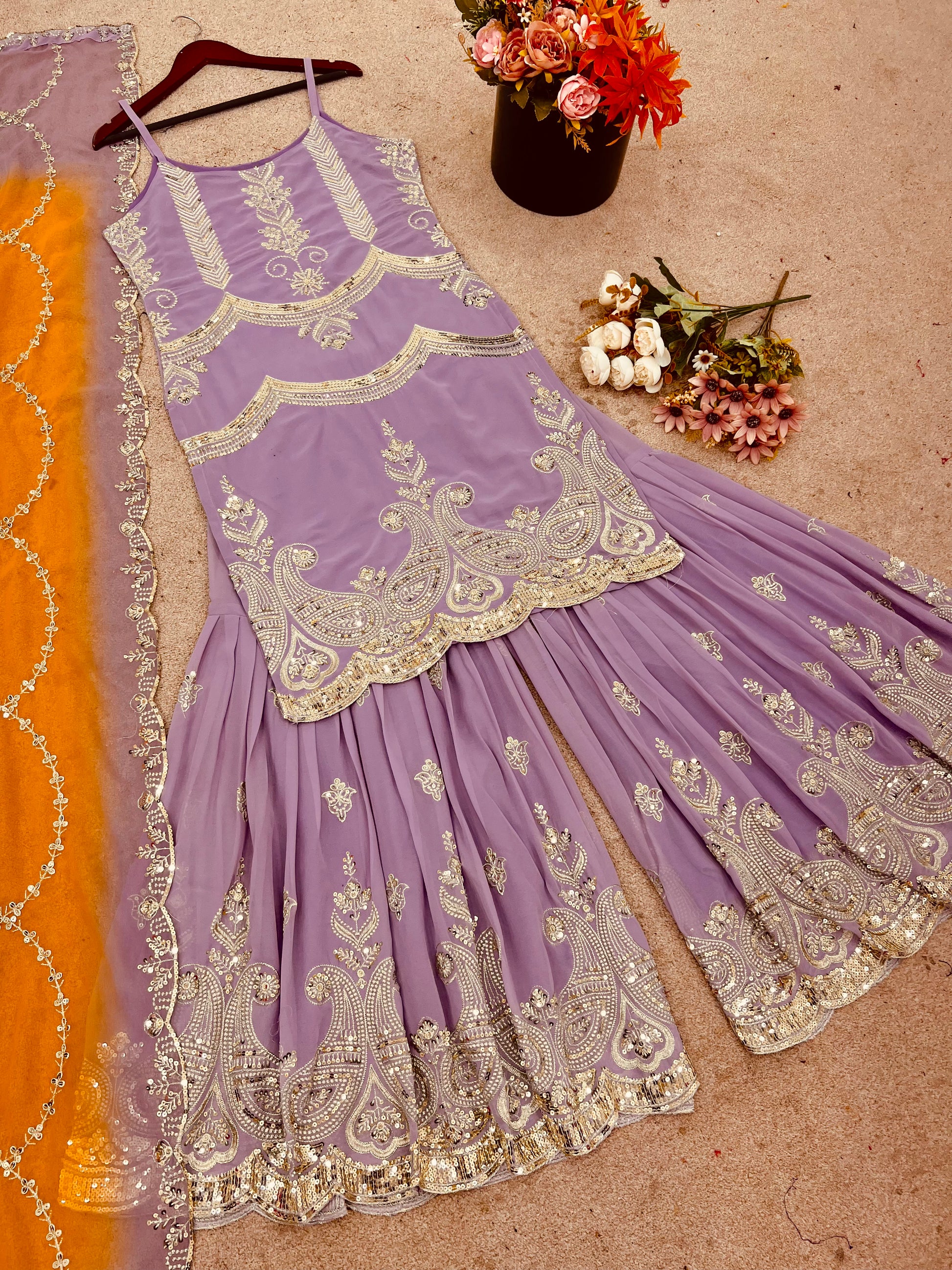 Heavy Faux Georgette Sharara Set, designed to make every festive moment unforgettable. Crafted with exquisite embroidery and sequin work, this ready-to-wear outfit exudes luxury and grace.