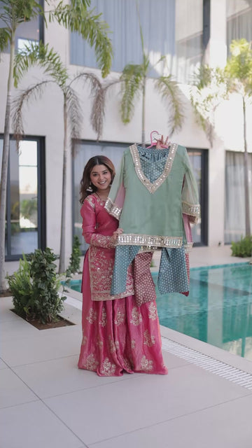 Designed to make you feel confident and stylish all day long, this readymade top–pant set comes with a matching batwa. Made with premium Salasa fabric and jacquard, the outfit features mirror and lace work for an elegant look. With a comfortable fit and cotton lining, this set is perfect for festive wear and special occasions.