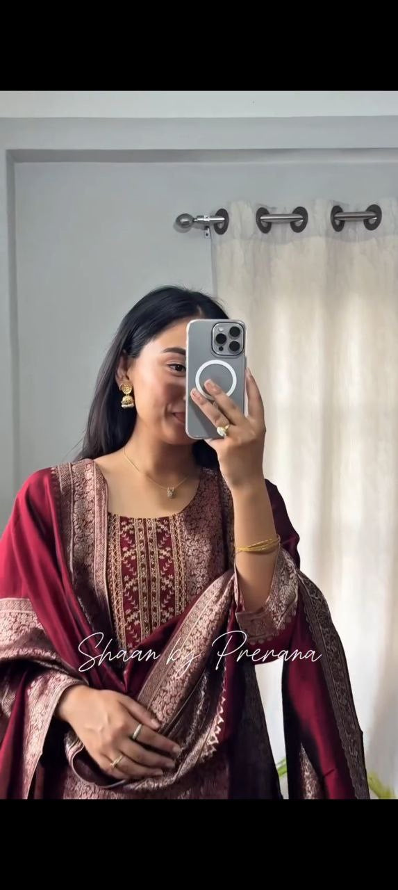 New arrival Asopalav suit set crafted in premium pure Banarasi fabric with beautiful jacquard weaving, traditional designs, and hand zari detailing. This branded collection includes a matching top, pant, and a pure woven zari jacquard dupatta. Comes with pure cotton lining for comfort and a shimmering bracelet set to complete the festive look. Perfect for gatherings, celebrations, and cultural events. MT
