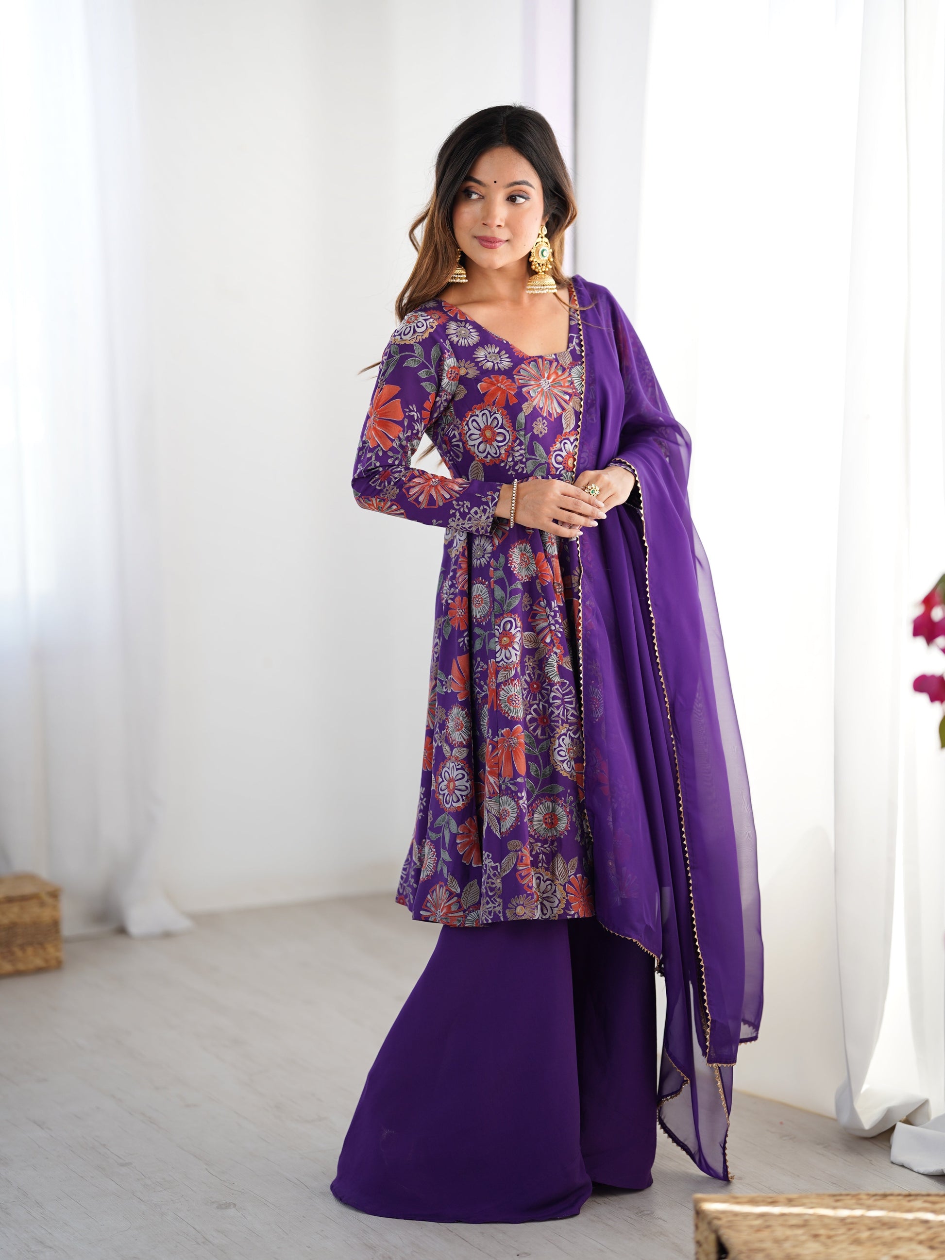 Purple Color Roman Silk Discharge Printed Plazzo Suit