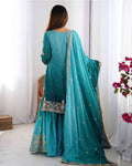 Graceful Rama-colored Chinnon palazzo suit adorned with delicate sequin work, paired with a stylish kurta and matching dupatta—ideal for festive gatherings and special occasions.
