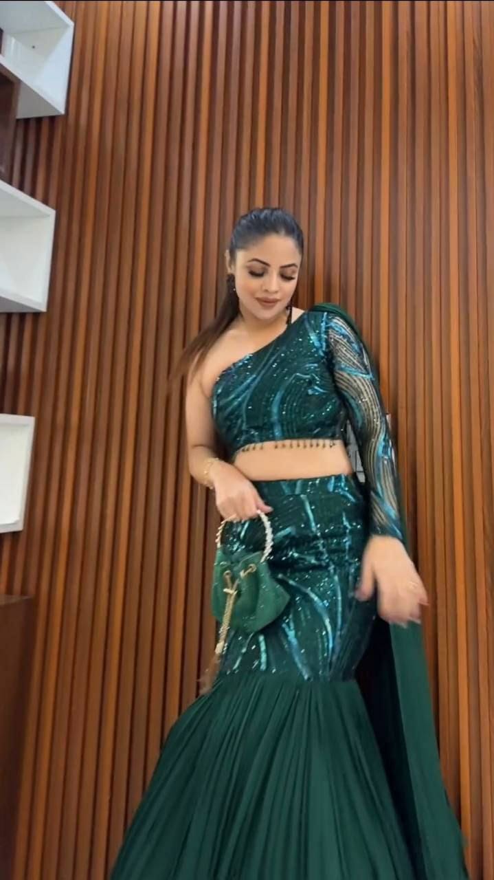 WORK : Beautiful embroidery and sequins work on both sides (front and back), with an attached dupatta made of heavy georgette ruffle layers.