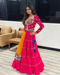 Work: 2-layer digital print with chandi and real mirror work, featuring a 10-meter flair and latkan.