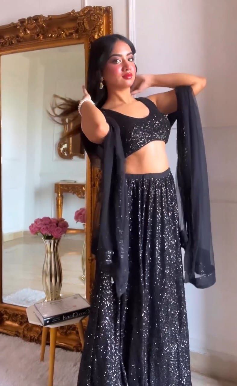 Introducing our exquisite Shimmery Black Lehenga, a perfect blend of elegance and allure. This enchanting ensemble features a rich black hue infused with a subtle shimmer that graceFullyy catches the light, adding a touch of glamour to your every move. The finely crafted lehenga boasts intricate detailing and a flattering silhouette, making it an ideal choice for special occasions, weddings, or festive celebrations. Elevate your style with this timeless piece that seamlessly combines tradition with modern sophistication.