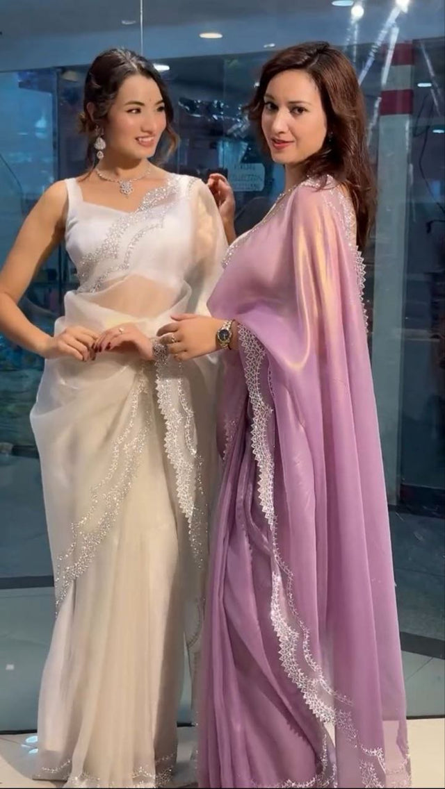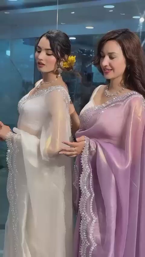 It comes paired with a matching blouse adorned with rich diamond work, completing the glamorous look. Lightweight, graceful, and designed to make you stand out effortlessly.