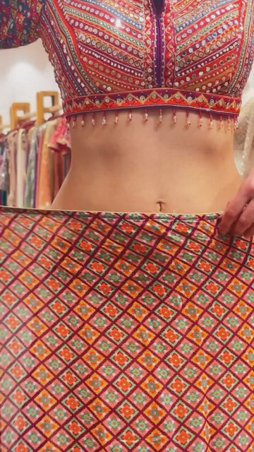 This elegant saree is crafted from premium Chinon silk and enhanced with beautiful prints and real mirror work all over. Designed to deliver a graceful drape with a rich ethnic appeal, this saree is ideal for festive gatherings and special occasions.