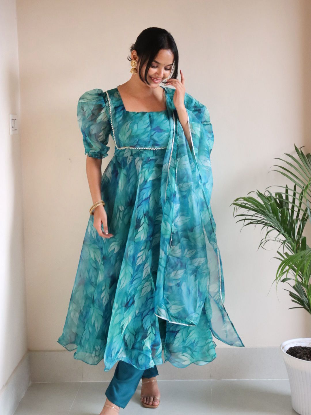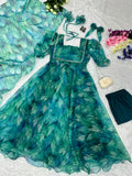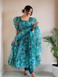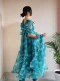 Trending Aqua Blue Printed With Beautiful Work Aliya Cut Suit