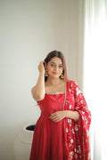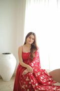Step up your ethnic game with our Manjula Maroon Anarkali Gown Suit Set. This stunning set features a deep maroon color and a traditional Anarkali silhouette, perfect for any special occasion. Complete with intricate detailing and comfortable fabrics, it's the perfect blend of elegance and comfort. Upgrade your wardrobe today!