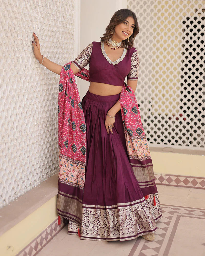 Wine Color Jacquard Lehenga Choli With Gaji Silk Dupatta