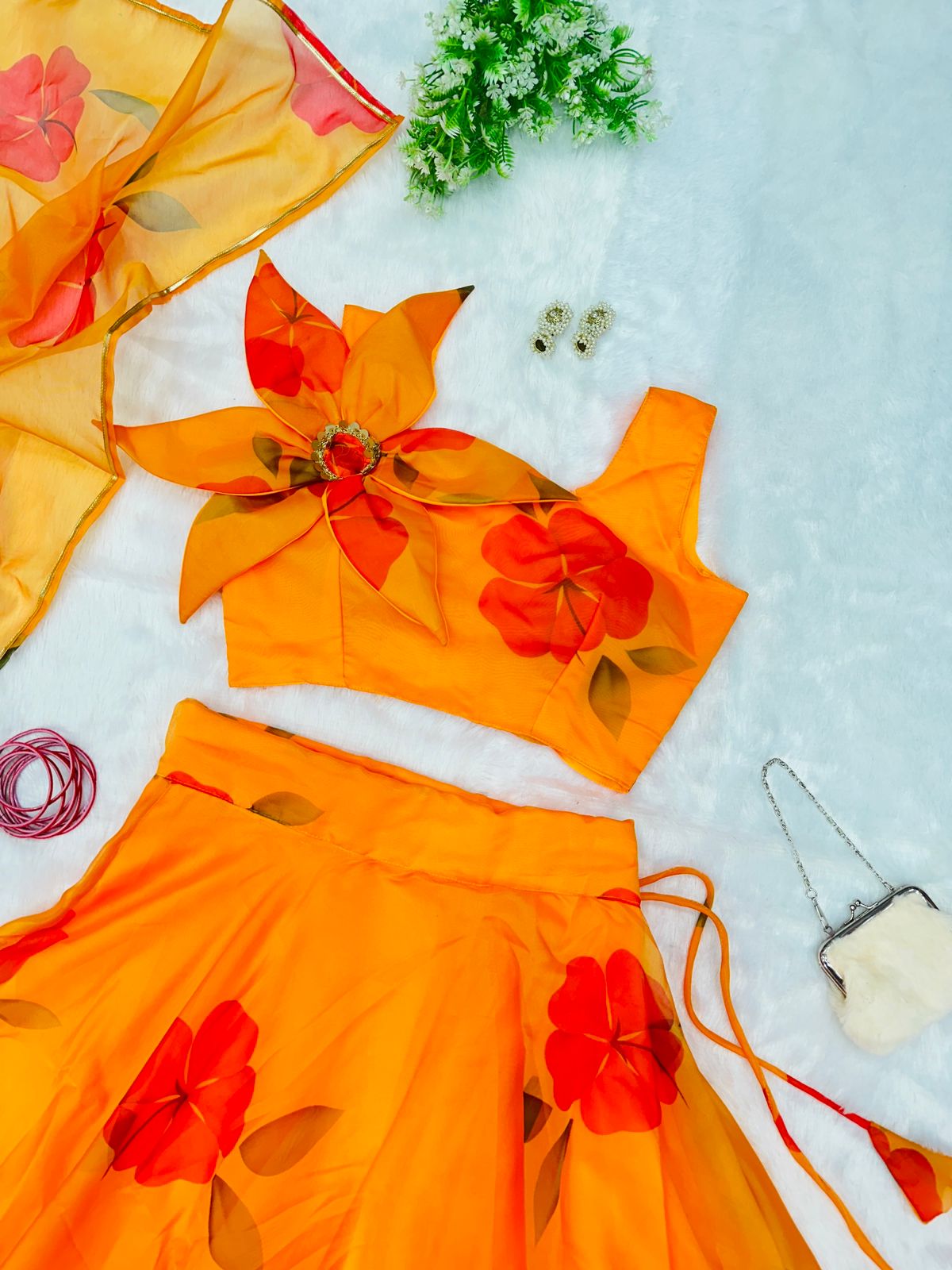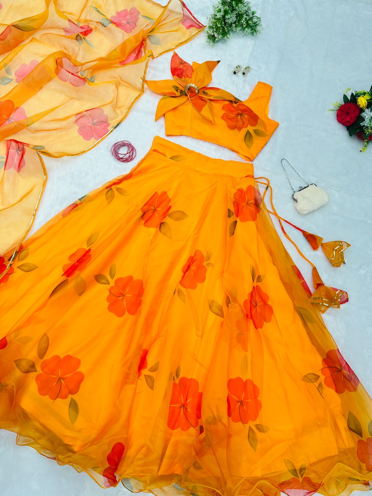 Yellow Color Organza Lehenga With Flower Pattern Blouse